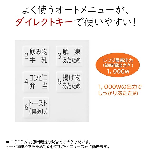 レンジ最高出力1,000W(最大3分間)ですばやくあたため。