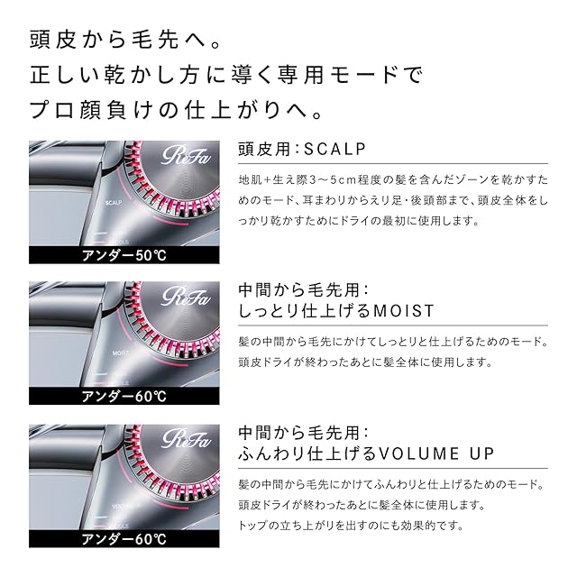 頭皮から毛先へ。正しい乾かし方に導く専用モードでプロ顔負けの仕上がりへ。