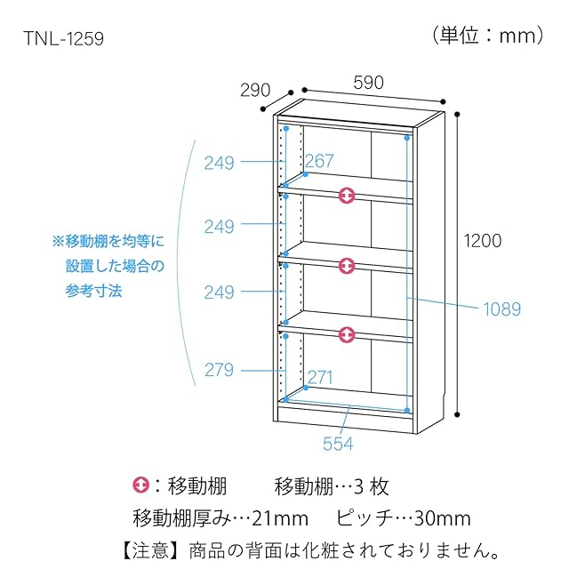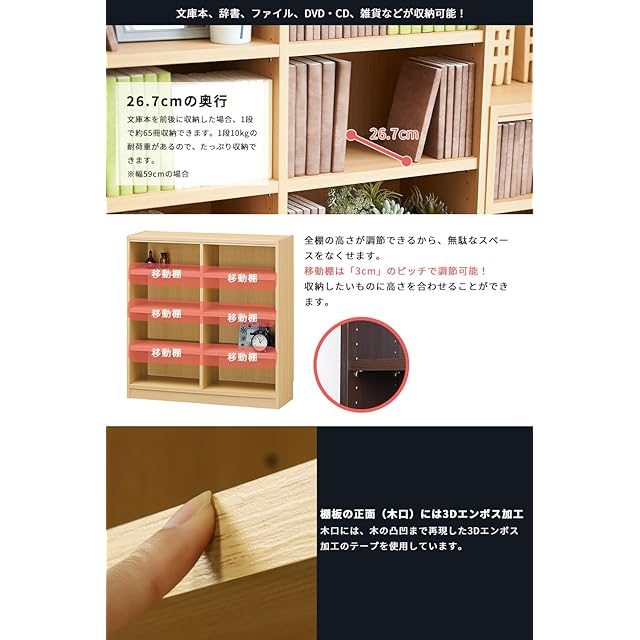 商品番号【TNL-1259-NA】<br> 棚板をすべて移動でき、A4ファイル・雑誌、コミックなど高さが異なる書籍もまとめて収納できます。<br> オリジナルピン付き棚ダボで側板が開くのを防ぎます。<br> 幅木よけ加工を施してあるので、本棚を壁面にピッタリ付けて設置できます。<br> 【商品詳細】<br> ■外寸:幅59×奥行29×高さ120cm<br> ■内寸:幅55.4×奥行26.7×高さ108.9cm<br> ■カラー:ナチュラル(ベージュ)<br> ■天板耐荷重:10kg<br> ■地板・棚板耐荷重:10kg<br> ■移動棚:3枚<br> ■棚板移動ピッチ:30mm<br> ■材質:[本体]プリント紙化粧繊維板<br> 【お客様の組立品】<br> ※組立に必要な工具:プラスドライバー、ハンマー、古雑誌<br> 【注意事項】<br> 背板は、中央でテープ留めになっています。<br> 本体の強度を維持する為、少なくとも移動棚1枚を中央付近に取付けて下さい。<br>