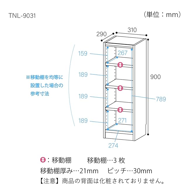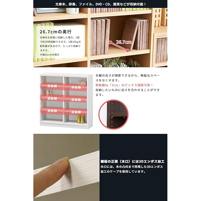 商品番号【TNL-9031-WH】<br> 棚板をすべて移動でき、A4ファイル・雑誌、コミックなど高さが異なる書籍もまとめて収納できます。<br> オリジナルピン付き棚ダボで側板が開くのを防ぎます。<br> 幅木よけ加工を施してあるので、本棚を壁面にピッタリ付けて設置できます。<br> 【商品詳細】<br> ■外寸:幅31×奥行29×高さ90cm<br> ■内寸:幅27.4×奥行26.7×高さ78.9cm<br> ■カラー:ホワイト<br> ■天板耐荷重:10kg<br> ■地板・棚板耐荷重:10kg<br> ■移動棚:3枚<br> ■棚板移動ピッチ:30mm<br> ■材質:[本体]プリント紙化粧繊維板<br> 【お客様の組立品】<br> ※組立に必要な工具:プラスドライバー、ハンマー、古雑誌<br> 【注意事項】<br> 本体の強度を維持する為、少なくとも移動棚1枚を中央付近に取付けて下さい。<br>