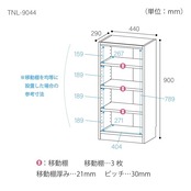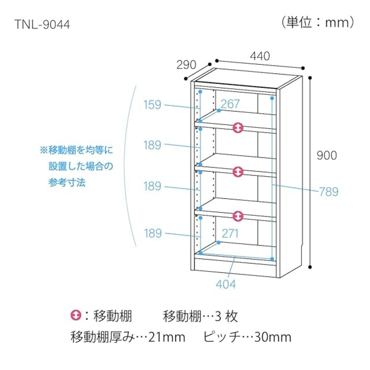 商品番号【TNL-9044-WH】<br> 棚板をすべて移動でき、A4ファイル・雑誌、コミックなど高さが異なる書籍もまとめて収納できます。<br> オリジナルピン付き棚ダボで側板が開くのを防ぎます。<br> 幅木よけ加工を施してあるので、本棚を壁面にピッタリ付けて設置できます。<br> 【商品詳細】<br> ■外寸:幅44×奥行29×高さ90cm<br> ■内寸:幅40.4×奥行26.7×高さ78.9cm<br> ■カラー:ホワイト<br> ■天板耐荷重:10kg<br> ■地板・棚板耐荷重:10kg<br> ■移動棚:3枚<br> ■棚板移動ピッチ:30mm<br> ■材質:[本体]プリント紙化粧繊維板<br> 【お客様の組立品】<br> ※組立に必要な工具:プラスドライバー、ハンマー、古雑誌<br> 【注意事項】<br> 背板は、中央でテープ留めになっています。<br> 本体の強度を維持する為、少なくとも移動棚1枚を中央付近に取付けて下さい。<br>