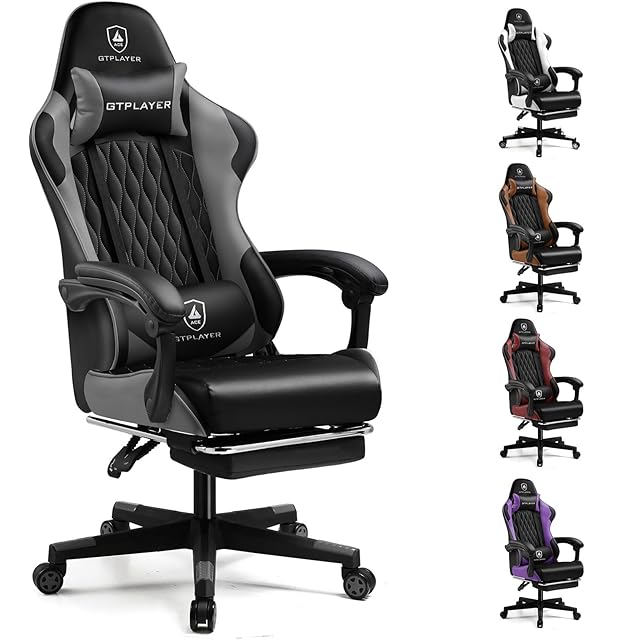GTRacing ゲーミングチェア オフィスチェア デスク pcチェア 椅子 テレワーク 145°リクライニング オットマン付き ゲームチェア ハイバック ランバーサポート ポケットコイルが内蔵 PUレザー (GRAY) | emishop315