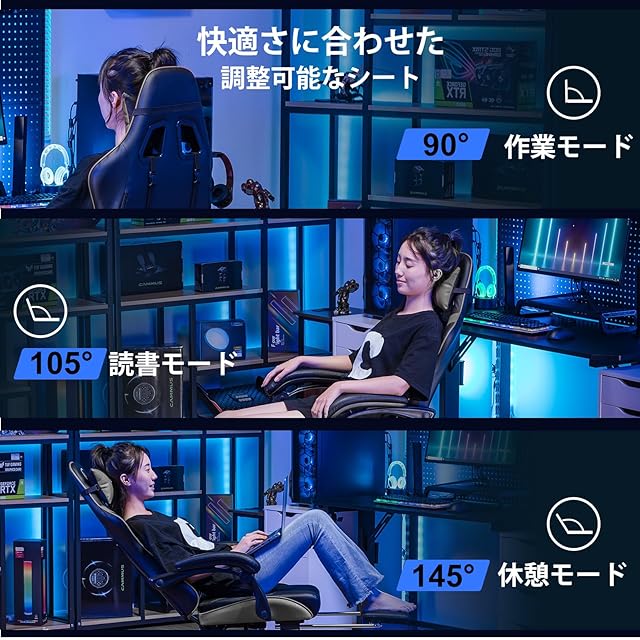 【くつろぎスペースを実現するリクライニング機能】 ゲーミングチェアの背もたれは90°から145°まで無段階に自由に調整可能です。自分の理想的な姿勢で座ったり横になったりでき、疲れにくいサポートが叶うリクライニングチェアです。