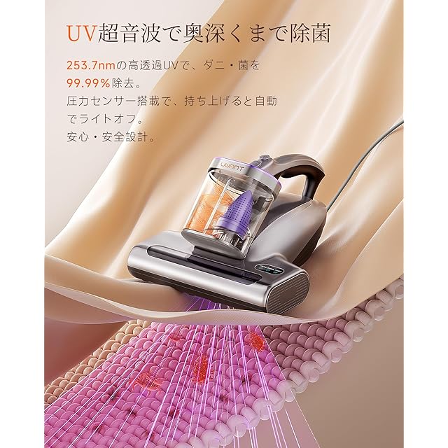 【UV紫外線+超音波でダブル除螨、安心設計】: 253.7nmの高透過UVライトを採用し、重力感知によって接地時のみ照射。人体やペットへの誤照射を防止します。さらに超音波でダニの繁殖を抑え、科学的にアレルゲンをケア。敏感肌や赤ちゃんのいるご家庭にもおすすめのダニ対策人気モデルです。
