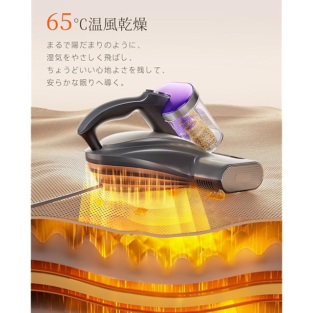 【65℃の恒温熱風乾燥で除湿&ダニ対策】:本体底部に設けられた下向きの送風口が、モーターの熱を効率よく寝具へ伝達。三次元の立体熱風乾燥を実現し、さらっと快適な睡眠環境を作ります。湿気によるダニの繁殖を効果的に防ぎます。