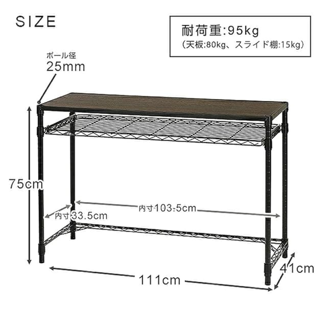 商品名:ドウシシャ ルミナス ノワール デスク 机 キッチンボード 作業台 黒 2段 幅110 奥行40 スライド棚付き ウッドシェルフ スチールラック 頑丈 コの字バー ブラック おしゃれ 幅81×奥行41×高さ75cm 耐荷重80kg NO1175-HD