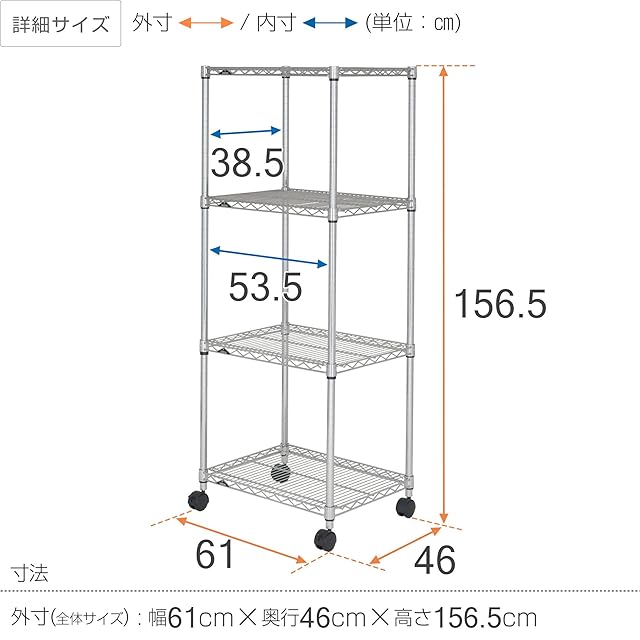 サイズ:(約)幅61×奥行46×高さ156.5cm※高さはナイロンキャスター装着時の物です。(標準アジャスターの場合(約)-5.5cmとなります。)