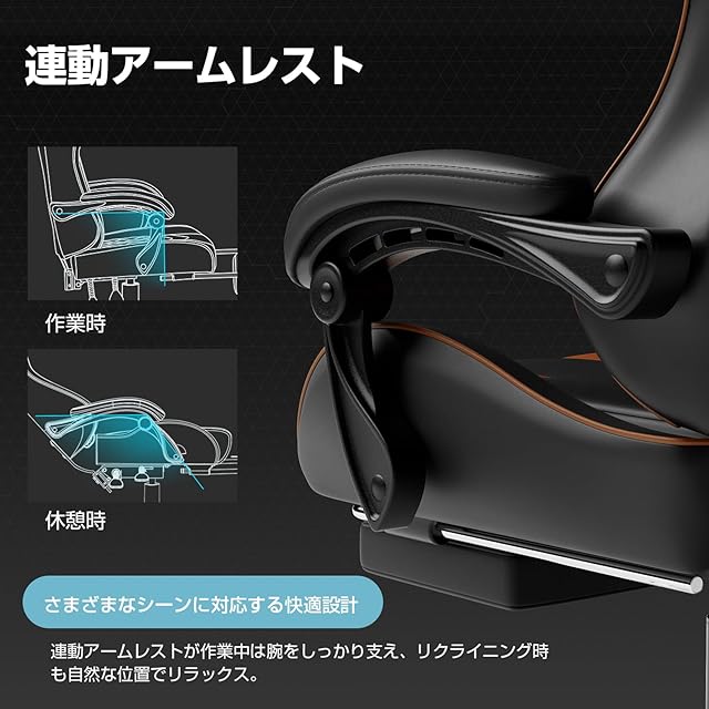 【ひじの安定を守る連動型アームレスト】座った姿勢を整える際、負担をかけない連動型アームレストを設置。複雑な調整が不要で、背もたれの角度によってアームレストが自動的に変わります。