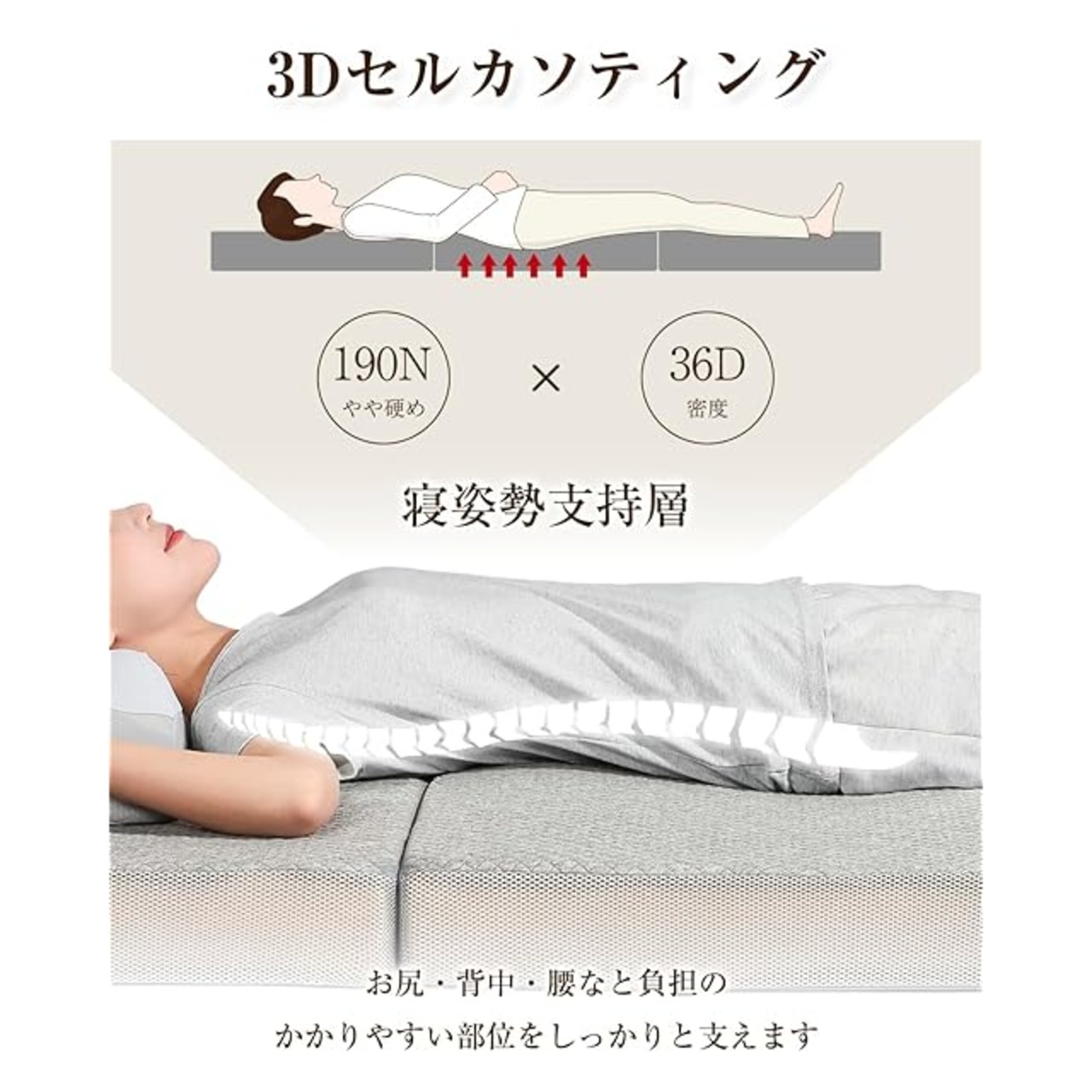 【高反発で寝返りがしやすいの理由】当社のマットレスは、睡眠中の人体の様々な姿勢をシミュレートする10万回の圧力テストを受け、スプリングとフォームの耐久性をしています。 マットレスの湿気除去率と空気循環性能を最適化する通気性テストに合格。 年齢も体型も異なる1,000人のユーザーにマットレスを試してもらい、寝心地、サポート力、通気性の評価を含む睡眠のフィードバックを集めました。国際的な睡眠の専門家を製品開発に参加させ、人間工学と健康的な睡眠の観点から改善点を提案しています。 専門家チームは、製品が健康的な睡眠の基準を満たすよう、マットレスのサポート力と寝心地を厳しく評価した。 ユーザーからのフィードバックに基づき、私たちはマットレスの素材比率や構造設計を何度も最適化し、多くの人のニーズを満たす的レスに仕上げています。
