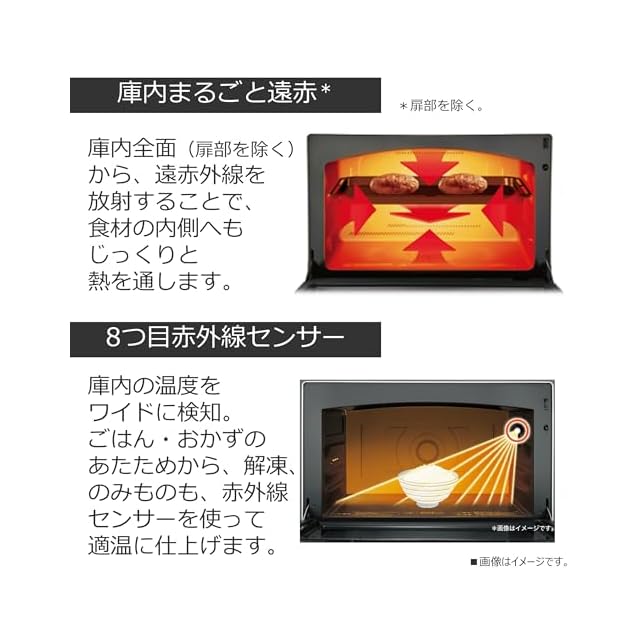 ✅【庫内まるごと遠赤】庫内全面(扉部を除く)から遠赤外線を放射することで、食材への内側へもじっくりと熱を通すからおいしく焼き上げる。