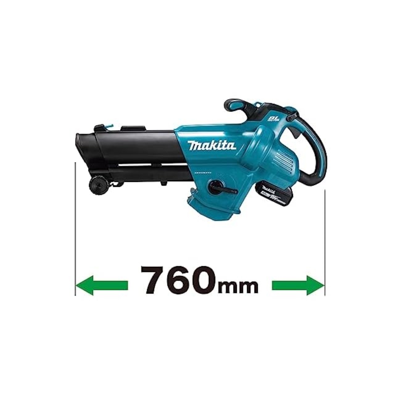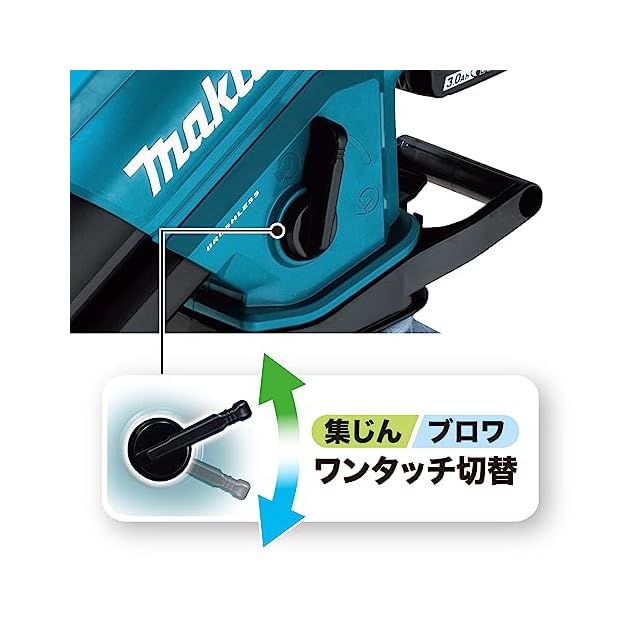 直流18V、スライド式Li-ionバッテリ仕様。バッテリ・充電器別売。ブロワ風量:4.2m3/分、風速(ノズル付)最大:64m/s、平均:52m/s。集じん最大風量:6.1m3/分、集じん量:25L。1充電連続運転時間(BL1830B使用時目安)ブロワ:約20~8分/集じん:約19~7分(クルーズコントロール時)バッテリの充電状態や作業条件により異なります。