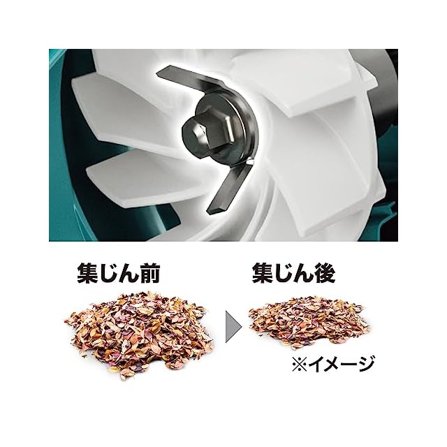 「高耐久」金属シュレッダー刃。吸込んだ枯葉を細かく粉砕。吸込み後の枯葉体積を低減させることで、効率良く集じん。絞った吹き出し口で吹き飛ばし。クルーズコントロール+トリガ無段変速。任意の風量で固定でき、連続作業時に便利。トリガ操作でも風量調整可能。