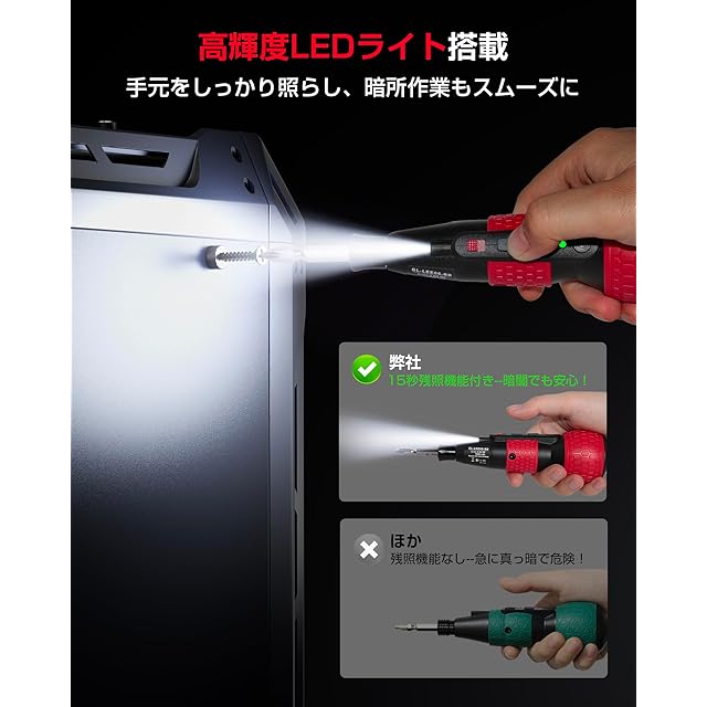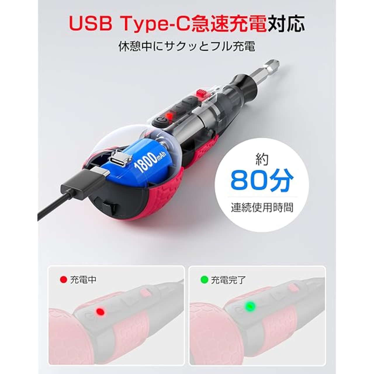 商品名:Yacooda 電動ドライバー 小型 強力 トルク3段階調整 【高い同心度・ビット振れ軽減】 電動4N.m 手動12N.m USB-C充電式 高輝度LEDライト 軽量 DIY 操作簡単 女性/初心者対応 電動ドリル ペン型 父の日 誕生日プレゼント レッド
