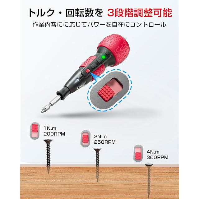 ✅【新機能・トルク3段階調整】Yacooda 電動ドライバーは、1つのボディで2つの回転モード&トルク3段階調整が可能!赤いボタンを押すだけで、【低】、【中】、【高】のトルクを簡単に切り替えられます。【低】トルクは1N・mで、電子端子台など、破損しやすい部品に。【中】トルクは2N・mで、DIYや家具の組み立てに。【高】トルクは4N・mで、回転数やトルクが必要な締め込みに。手回し時の最大耐久トルク:12N・mです。使用シーンに合わせて、最適なトルクを選んで快適に作業が進められます!