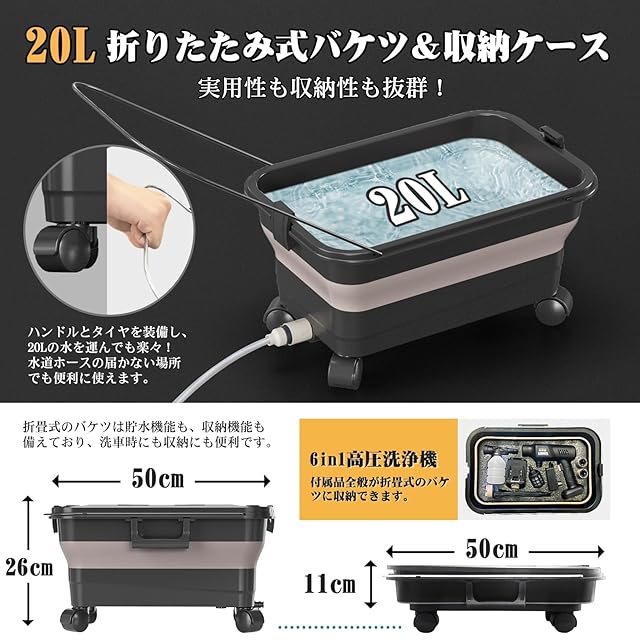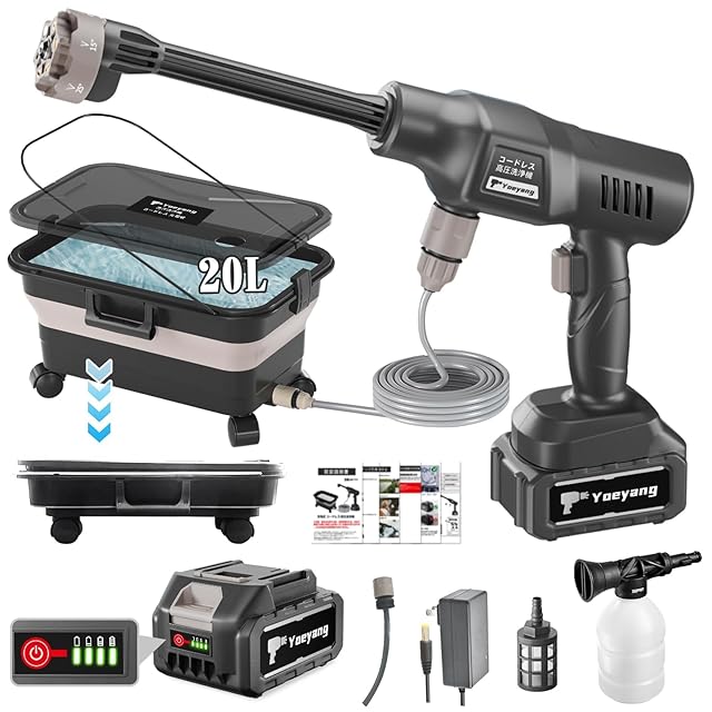 高圧洗浄機 コードレス 充電式 20L折り畳みバケツ付き 残量表示 PSE認証済バッテリー マキタバッテリー互換 高圧噴射 6in1ノズル 10mホース付き 洗車 墓石掃除 海での砂落とし 泥 自転車