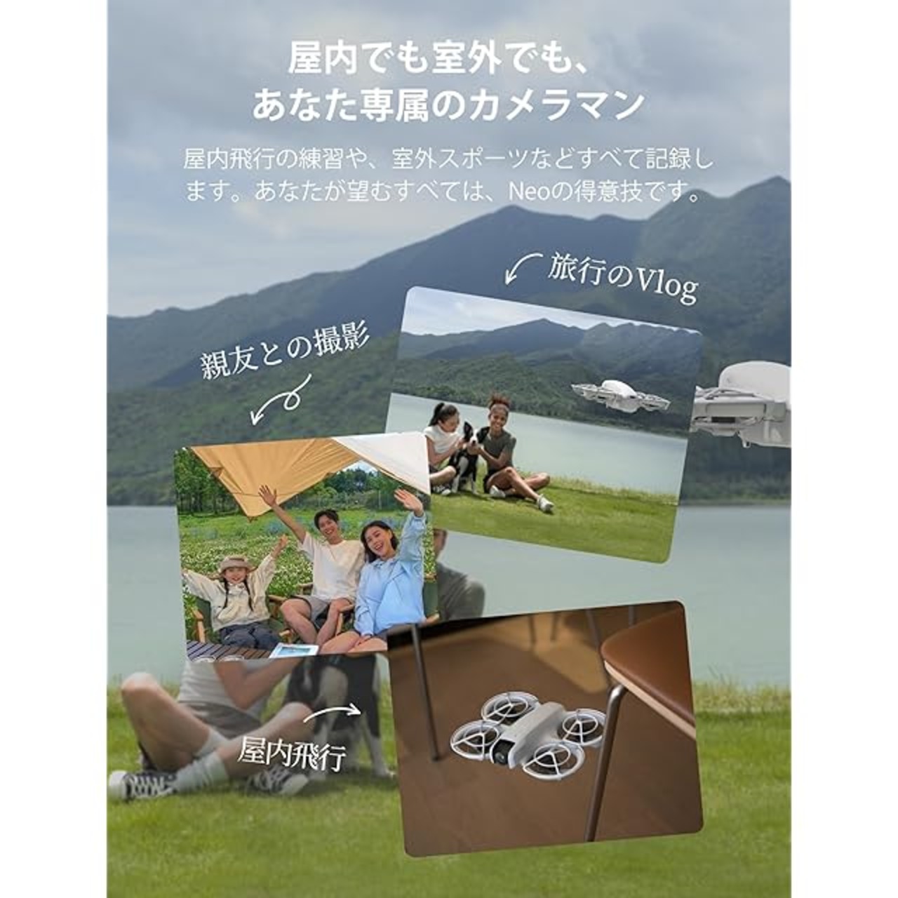 ✅【軽量かつ携帯性抜群のDJI Neo】135gのDJI Neoは、DJIのドローンの中で軽量かつ携帯性に優れたモデルです。小型軽量設計により、どこにでも簡単に持ち運べ、瞬時に飛行準備が整います。旅行やアウトドア活動のお供に、またプロの映像制作にも最適です。この軽量ドローンで、想像力を広げ、新たな視点で世界を撮影しましょう。