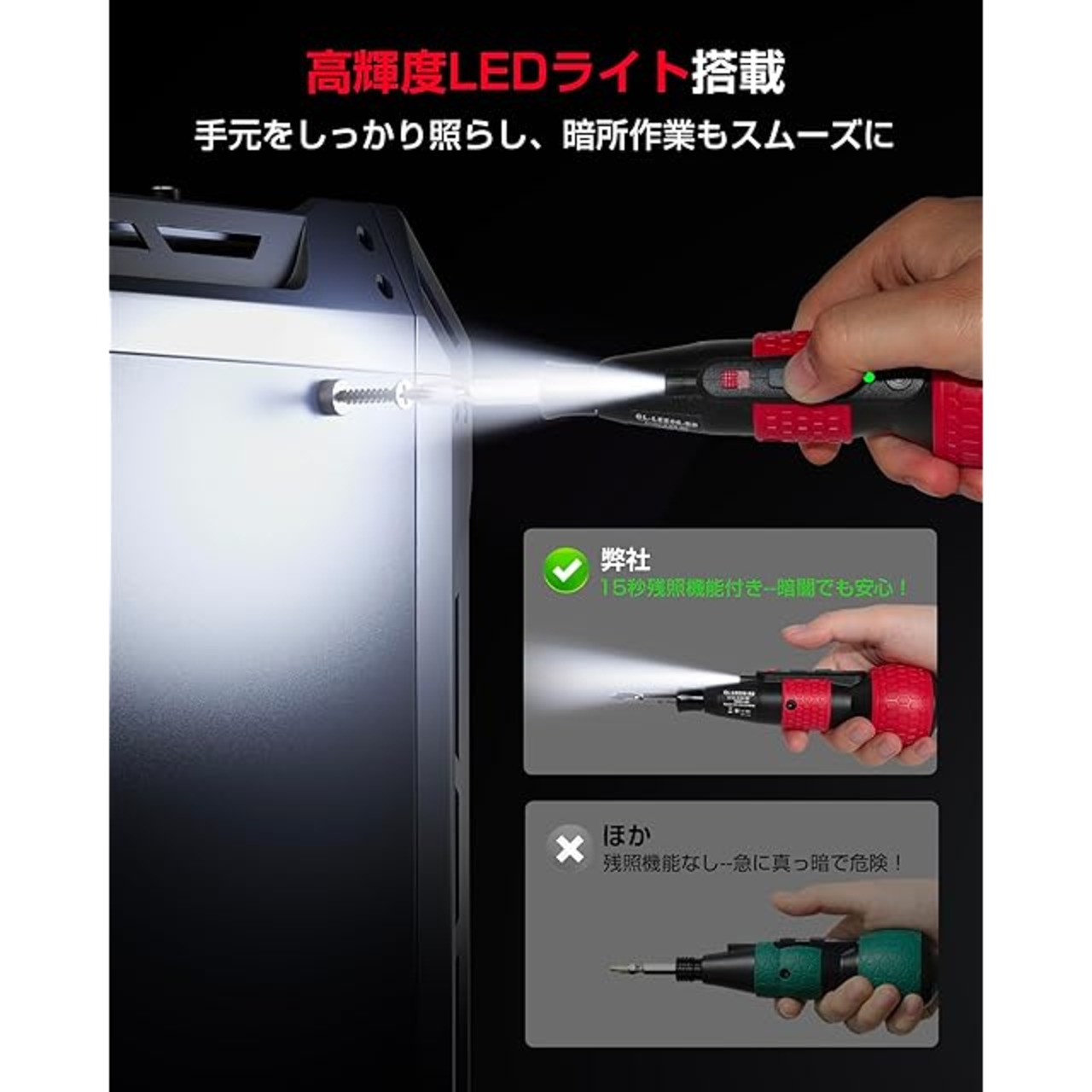 ✅【手にしっかりフィット・力を入れやすい】人間工学に基づいたグリップデザインで、手にしっかりフィットし、安定感抜群!滑りにくいグリップが、どなたでも快適に使えます。軽量設計で、手軽なサイズ感のため、長時間の作業でも疲れにくく、約200gと女性でもストレスなく使えます。初心者でもプロでも、この電動ドライバーなら安心して様々な作業ができます。力を入れやすく、作業の効率もアップ!