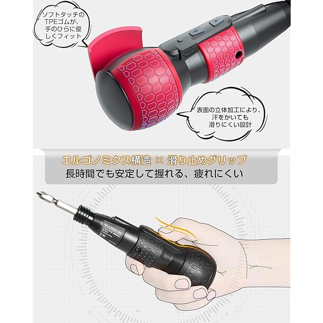 ✅【コンパクト・軽量・コードレス設計】手軽なサイズ感と軽量設計で長時間の作業も楽にできる電動ドライバーです。本体は約200gの軽量設計、女性にもストレスなく長時間使用できます。充電式コードレスタイプでどこでも気軽に作業できます。コンセントがない場所でも使えるうえ、作業中にコードが邪魔にならず取り回しが格段に優れています。
