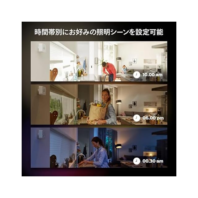 【時間帯に合わせた照明】時間帯で設定を変えることができるので、昼間は活動しやすい昼白色、夜には落ち着いた電球色といったHueシリーズの特性を生かした設定ができます。