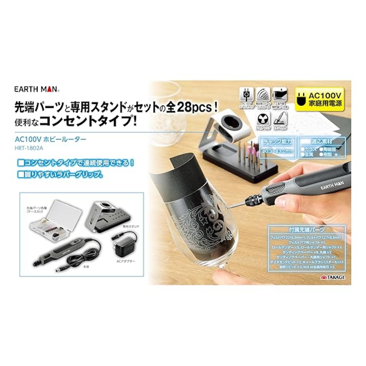 高儀(Takagi) EARTH MAN ホビールーター スタンド付 HRT-1802A ミニルーター リューター ペン型 工具 ビット バフ 砥石 セット 彫刻 金属 研磨 切断 模型 工作 コンセントタイプ 無段階スピードコントロール 3つ爪チャック