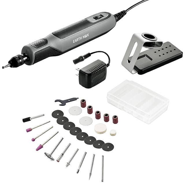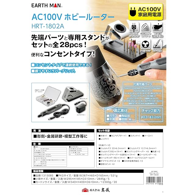 商品名:高儀(Takagi) EARTH MAN ホビールーター スタンド付 HRT-1802A ミニルーター リューター ペン型 工具 ビット バフ 砥石 セット 彫刻 金属 研磨 切断 模型 工作 コンセントタイプ 無段階スピードコントロール 3つ爪チャック