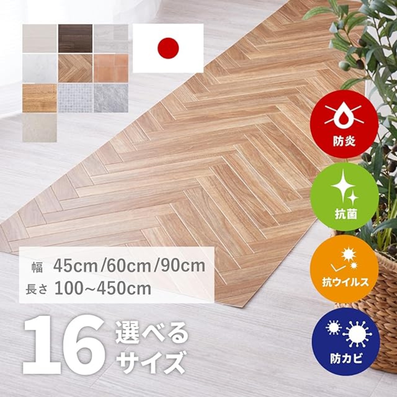 表素材は、塩化ビニール素材です。食べ物や飲み物をこぼしても、サッと簡単に拭き取ることが出来ます。防炎・抗菌・防カビ・抗ウイルス機能付きで水をはじくので、キッチンマットとしてもおすすめです。 滑り止めシール付きでズレ防止も安心です。