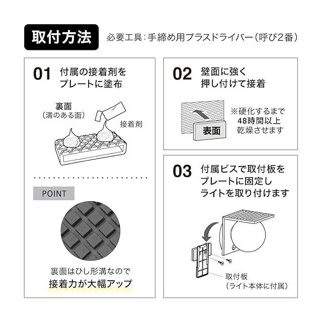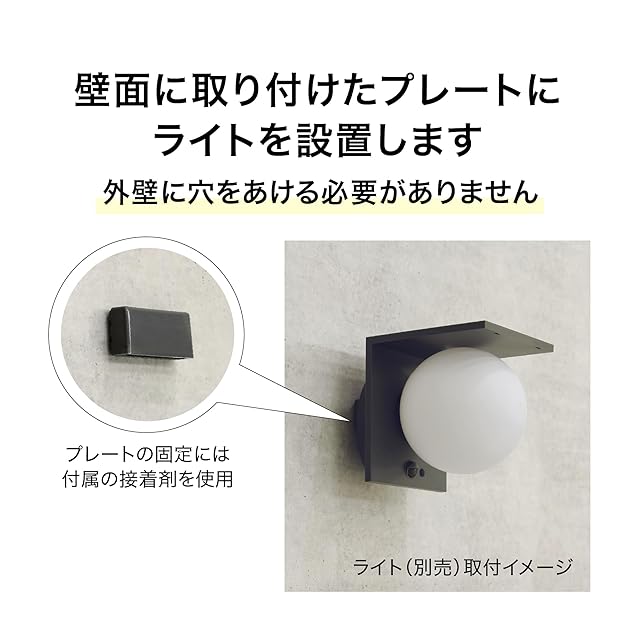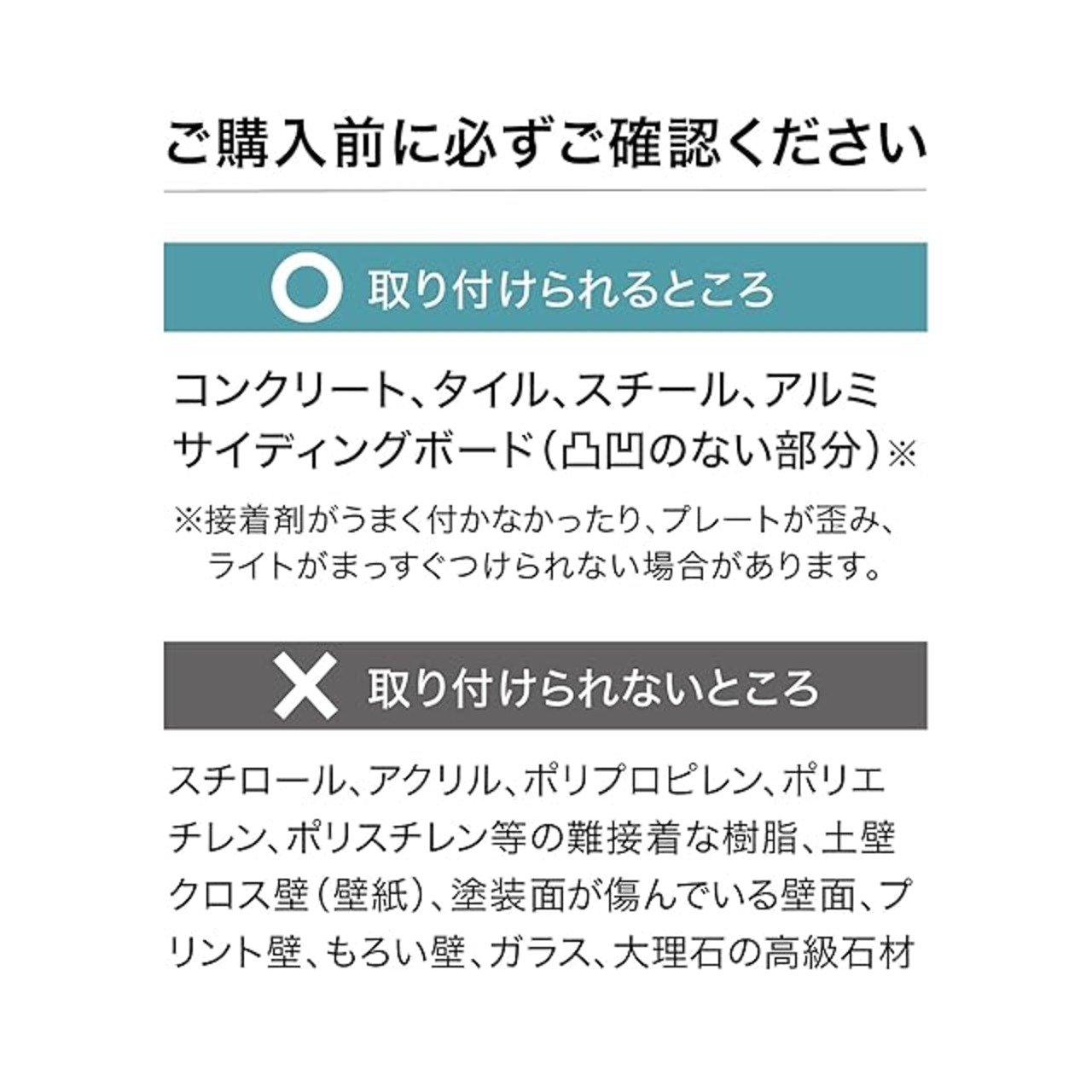 取付可能な外壁の材質:コンクリート、タイル、金属、アルミ、サイディング、窯業系サイディング - 凹凸のない部分-。※接着剤がうまく付かなかったり、プレートが歪み、ライトがまっすぐつけられない場合があります。 取り付けられない所:スチロール、アクリル、ポリプロピレン、ポリエチレン、ポリスチレン等の難接着な樹脂、土壁クロス壁(壁紙)、塗装面が傷んでいる壁面、プリント壁、もろい壁、ガラス、大理石の高級石材。