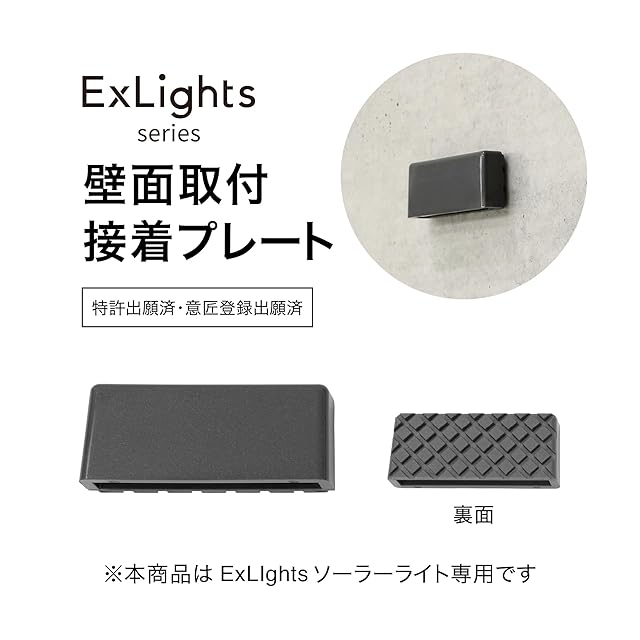 ExLightsシリーズ、壁面取付接着プレート。付属の取付ビスと接着剤で、外壁に穴を空けずに屋外照明を取り付けられます。