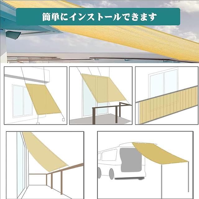 【高級素材を採用され】耐久性に優れた100%ポリエステル生地素材を採用され、 強力な縫い目と各コーナーの耐久性のあるステンレス鋼Dリング、四辺にアルミ製のハトメ付き、 設置簡単、紐6本で固定しやすい。コーナーごとにナイロンロープが付いています。