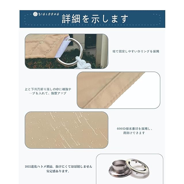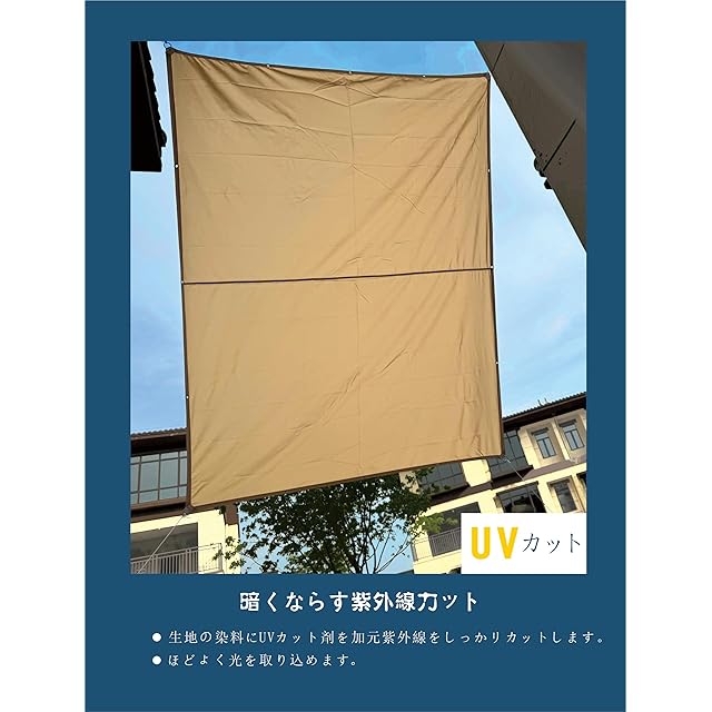 【高級素材を採用され】耐久性に優れた100%ポリエステル生地素材を採用され、 強力な縫い目と各コーナーの耐久性のあるステンレス鋼Dリング、四辺にアルミ製のハトメ付き、 設置簡単、紐6本で固定しやすい。コーナーごとにナイロンロープが付いています。