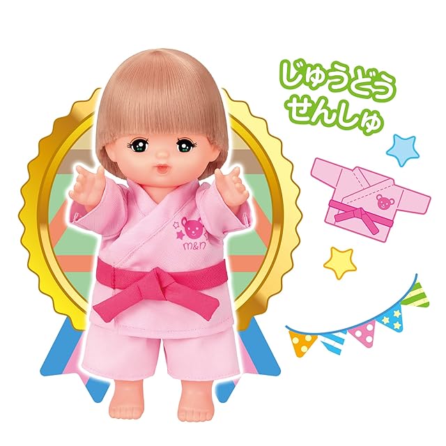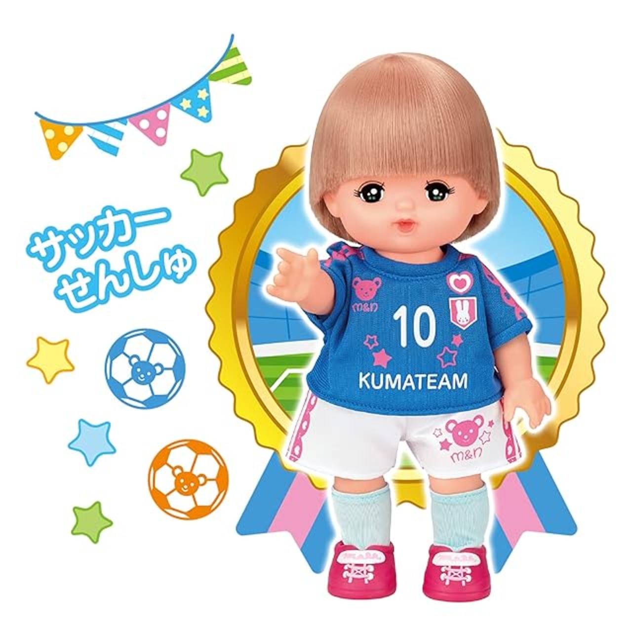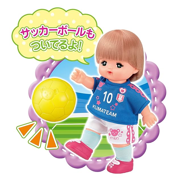 セット内容:ショートヘアメルちゃん本体(はかせるおむつ付)、サッカー風ユニフォーム(上下)、くつした、柔道着風ユニフォーム(上下)、スニーカー、サッカーボール、くし、はじめてブック