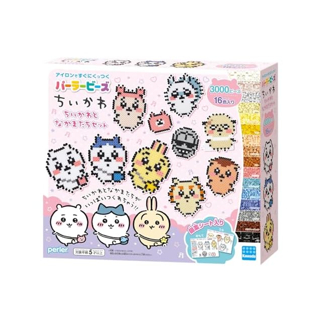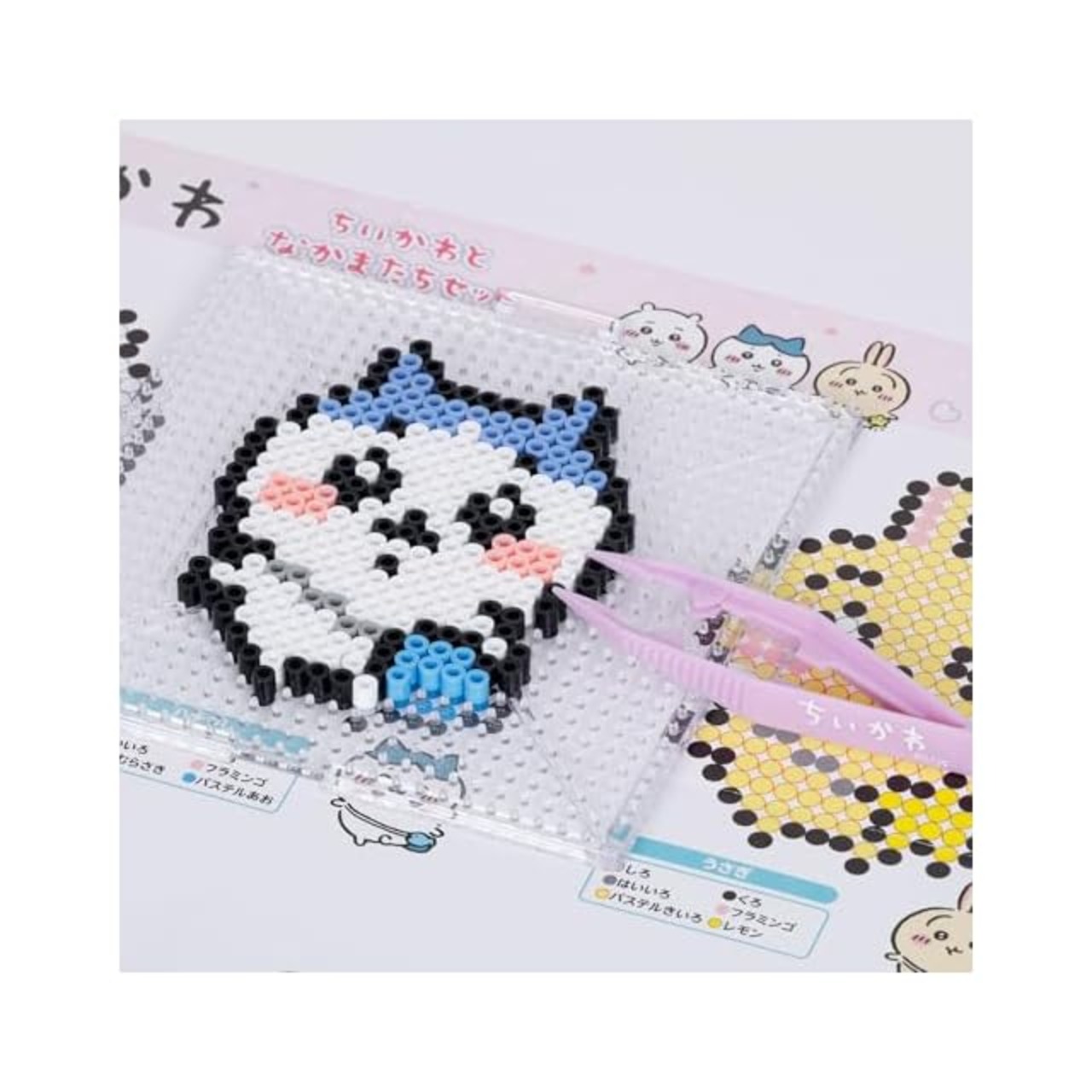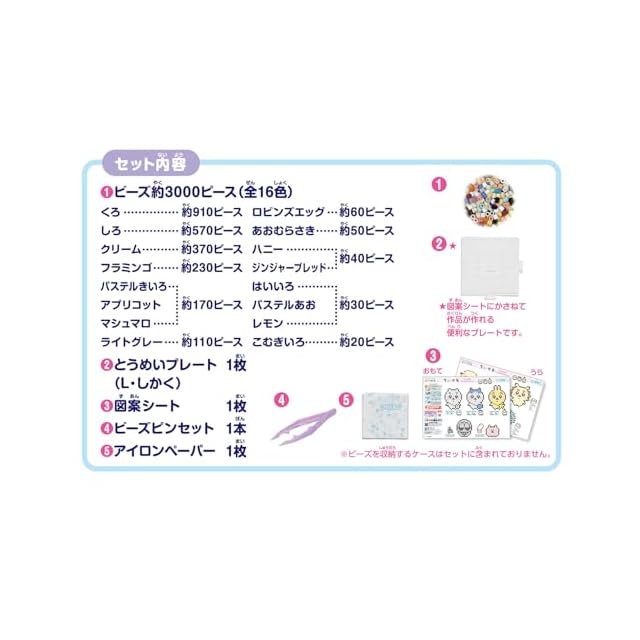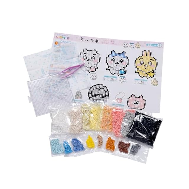 人気のちいかわたちがいっぱい作れちゃう!●キャラクターラインナップは全部で10種!手のひらサイズのかわいい作品が作れます。<br>●ビーズは3,000ピース、全16色入り。図案シートに重ねて作品が作れる便利な透明プレートとピンセットも入っているのですぐに遊べます!●「ちいかわ」のロゴ入りピンセットは、特別仕様のかわいいラベンダーカラー!