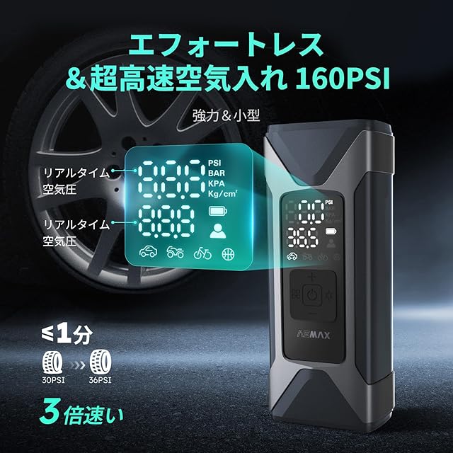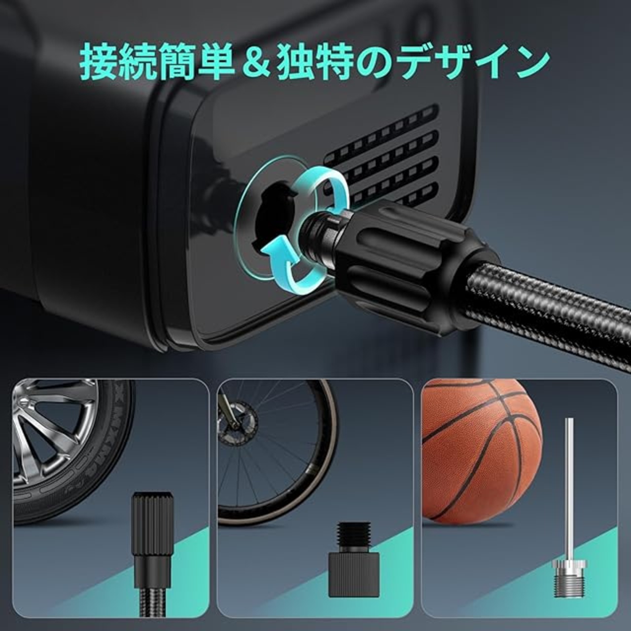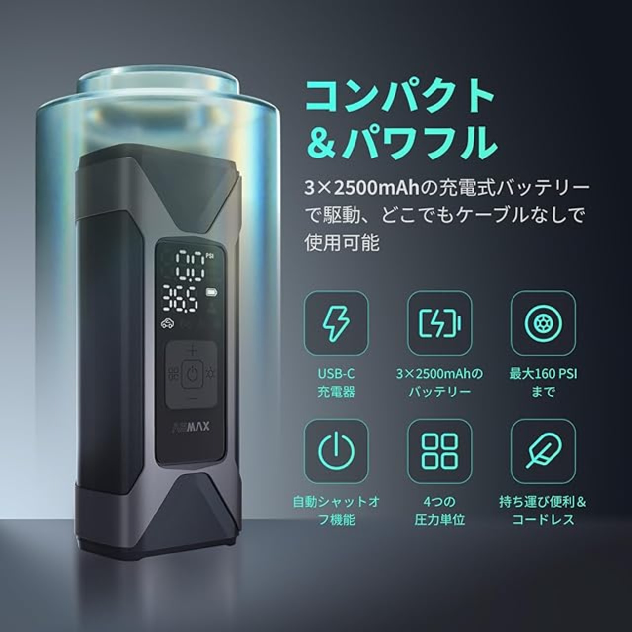 【万能な膨張力】当社のポータブルエアコンプレッサーは、車のタイヤ、オートバイのタイヤ、自転車のタイヤ、スポーツボールなど幅広いアイテムを膨らませるように設計されています 冒険中にタイヤがパンクしたり、ボールが抜けたりする心配はもうありません 【強力な7500mAhバッテリー】頑丈な7500mAhバッテリーを搭載し、高速かつ効率的な空気注入を実現する車用タイヤ用ポータブルエアコンプレッサーです 最大150PSIの圧力を楽しむことができ、タイヤを素早く膨らませることができ、すぐに道路に戻ることができます 【クイックインフレーションテクノロジー】高度な空気注入技術により、当社のポータブルタイヤインフレーターは急速に空気を入れ、時間と労力を節約します 標準的な車のタイヤをわずか数分で膨らませることができ、緊急時や素早いタイヤメンテナンスに最適です 【LED懐中電灯内蔵】一体型のLED懐中電灯は、夜間の緊急時や低照度の状況でも明るい照明を提供します 暗い道を歩いているときも、車の中で何かを探す必要がある場合でも、この便利な機能により、暗闇の中に放置されることはありません 緊急パワーバンク:外出先でも接続を維持! 万能ポンプはモバイルバッテリーにもなり、万が一時にスマホなどの充電が可能です ロードトリップ、キャンプ、アウトドアに最適です コンパクト&ポータブルデザイン:軽量でコンパクト当社のエアポンプは持ち運びや保管が簡単です 車のトランク、バックパック、スポーツ用品に便利にフィットし、どんな旅にも理想的なパートナーです 【使いやすいインターフェース】直感的なデジタル表示とワンボタン操作で、誰でも簡単に使用できるエアーポンプです お好みの圧力を設定し、ポンプに任せるだけです 【耐久性と信頼性】高品質の素材で作られた当社のエアポンプは、耐久性と長期的なパフォーマンスのために設計されています すべての空気注入のニーズに必要な信頼性の高いツールです
