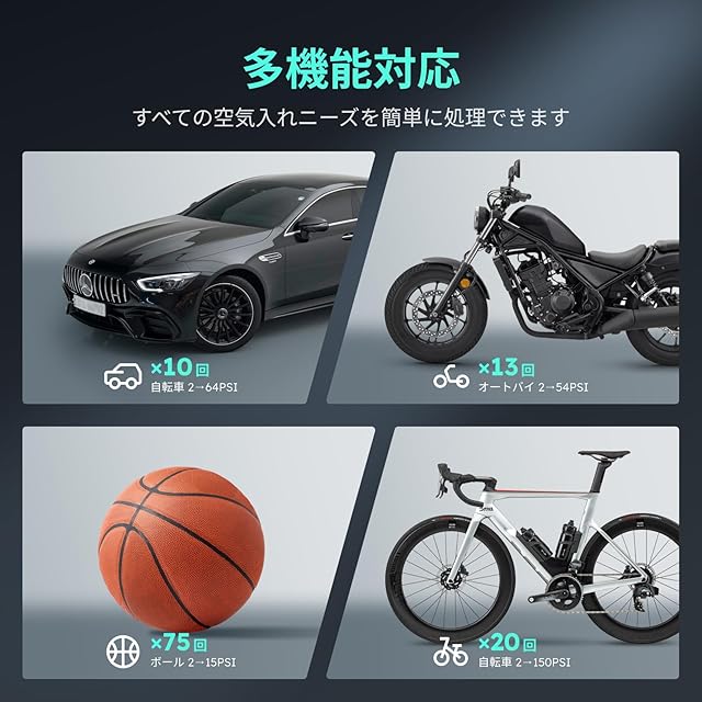 【幅広い用途】車、バイク、自転車、ボール、そしてカスタマイズモードを含む5種類の充填モードを提供。カスタマイズモードでは、最大999kpaまでの空気圧設定が可能です。付属品には50㎝米式バルブ付きのエアホース、仏式バルブ、英式バルブ、ボール用バルブ、浮き輪用バルブが含まれており、車、SUV、バイク、自転車、バスケットボール、浮き輪の充填に対応。日常のさまざまなニーズを満たします。