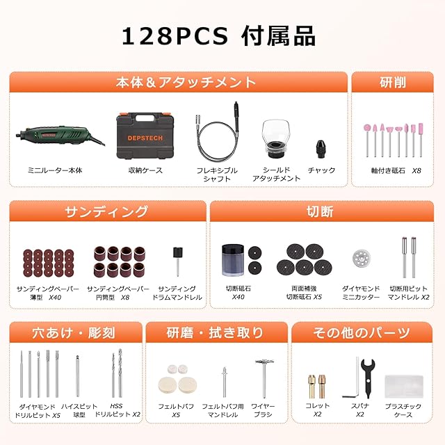 商品名:DEPSTECH ミニルーター 40000RPM高速回転 6段変速 128点アクセサリー 電動リューター ハンドルーター シールドアタッチメント 木工/彫刻/穴あけ/研磨/切断/切削/つや出し/マニキュア/汚れ落とし 日本語取扱説明書付き 12ケ月付