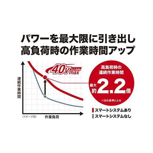 工具⇔バッテリ⇔充電器間で最適化デジタル通信。給電・充電共に最適化を実現し、高負荷時の連続作業時間アップ(最大約2.2倍※)・バッテリ長寿命化(約50%アップ※)を両立 ※マキタ基準による
