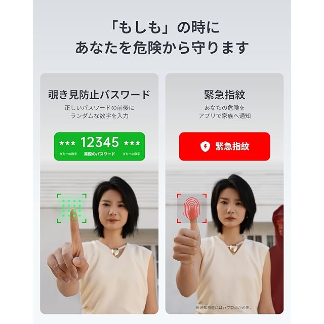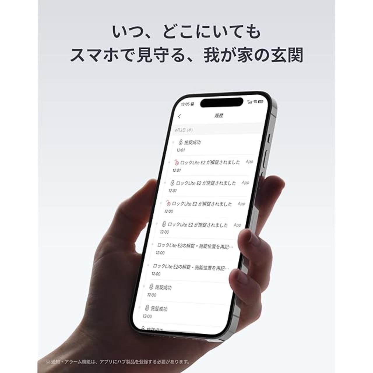 【絶対的な安心を】警報・通知/オートロック設定/緊急指紋・パスワード/データの保護・保存/閉め出し防止と、あらゆる方面のセキュリティ対策と防犯対策で絶対的な安心を実感していただけます。また、アプリからドアロックの開閉状態や履歴、バッテリーの残量などを随時確認でき、ドアが開閉されるとアプリに通知を送信、半ドア状態になると警報が鳴ります。さらに、予め設定しておいた緊急指紋/緊急パスワードで鍵を開けると、アプリ通知で家族に危険をお知らせ。バッテリー残量が低下すると、充電を促す通知がアプリに届きます。