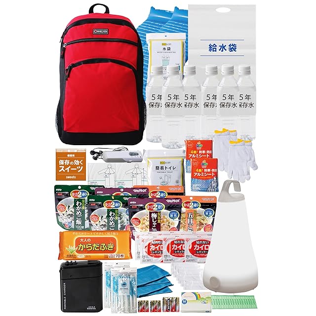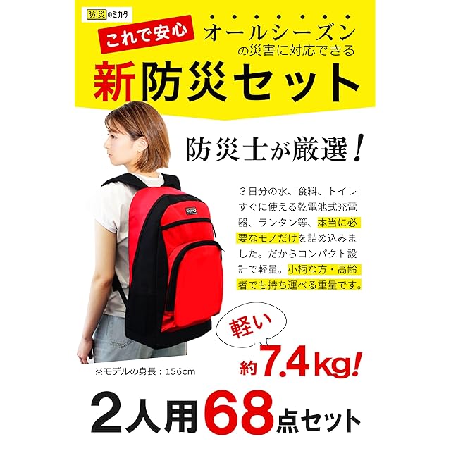 商品名:防災のミカタ 防災グッズ セット リュック 2人用 68点 赤 非常用リュック 【日本防災ブランド】 大容量リュック 非常用 簡易 トイレ 保存食 保存水