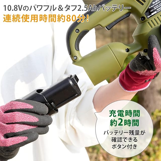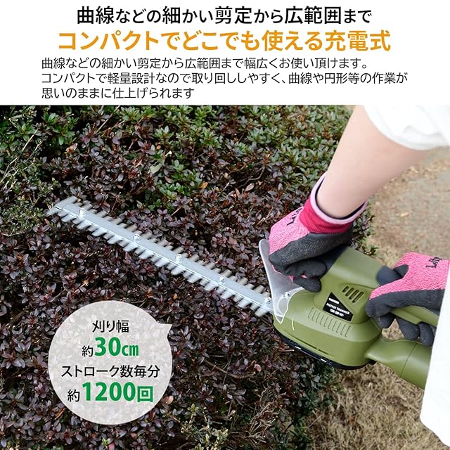 【商品仕様】本体サイズ:幅8.5×奥行57×高さ12cm/重量:1.3kg/定格電圧:DC10.8V/ストローク幅:約1,200min-1/刈込幅:約300mm/刃の材質:特殊鋼・クロムコーティング/充電器入力:AC100V(50Hz/60Hz)/充電器出力:1.5A/充電時間:約2時間/連続使用時間:約80分/バッテリー:2.5Ah リチウム電池/付属品:充電池、専用充電器、充電器電源アダプター、ヘッジトリマー刃、ブレードカバー、ハンドガード、ドライバー、取扱説明書