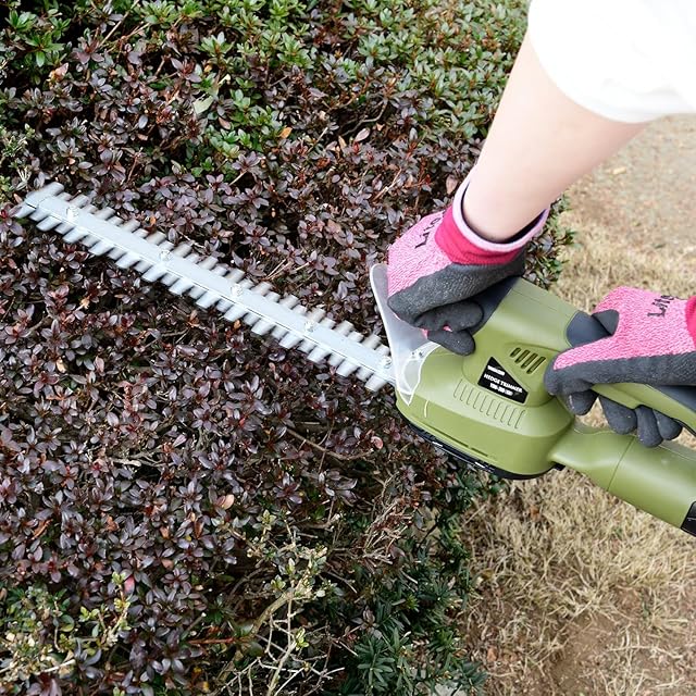 【特徴】庭木の剪定や生垣の刈込にオススメ、コンパクトでどこでも使える充電式コードレストリマーです。電動ヘッジトリマーだからお庭や生垣のお手入れも簡単、電気の力でモサモサした枝もバッサリ切れます。毎分約1200回のストローク数で、素早くしっかり刈り込めます。刃が左右に付いている両刃タイプで、刃の向きを変えずに使えるので作業効率が上がります。直径8mm未満の枝なら、あらかじめ剪定しなくてもそのままトリミングが可能で便利です。刈込幅約300mmで丁度いい大きさ。曲線などの細かい剪定から広範囲まで幅広くお使い頂けます。重さ約1.3kgと軽量で取り回ししやすく、植木の高さを一定にしたり生垣の側面をきれいにするのも手軽にできます。安全ボタンと運転スイッチを同時に押すと起動するダブルロック機能により、誤操作を防止します。