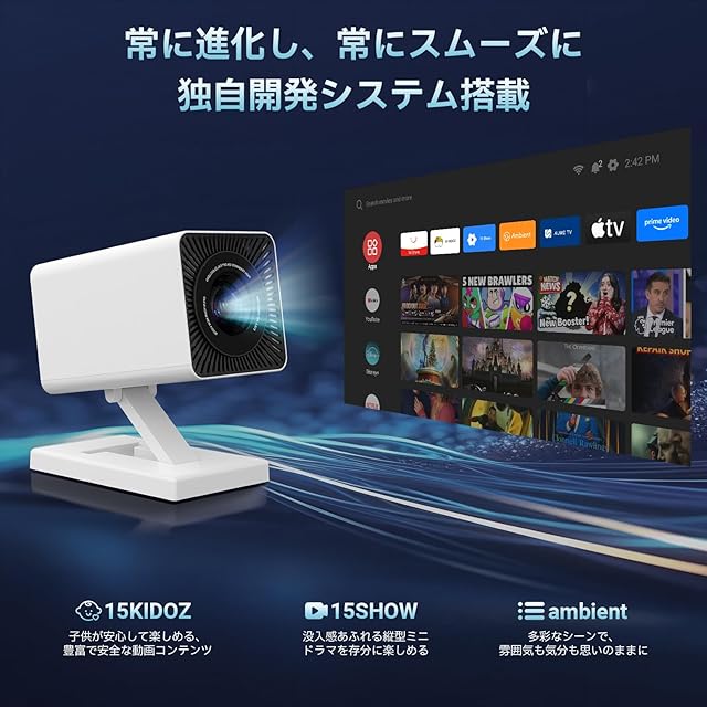 【8.19追加】家庭用ぷろじえくたーのシステムを最新バージョンに更新すると、子供が安心して楽しめる「15KIDOZ」動画アプリや、縦画面で没入感ある視聴ができる「15SHOW」英語ミニドラマアプリが追加され、豊富な映像コンテンツを無料で楽しめます。さらに「ambient(環境投影)」機能では、スマートフォンから写真や動画を送信し、壁を光とアートに満ちたダイナミックなキャンバスや季節・イベントに合わせた背景として演出可能。独自のシステムと継続的なコンテンツ更新により、常に進化した家庭シアター体験をお届けします。直感的でわかりやすいモバイルアプリ操作で、誰でも快適にコントロールできます。