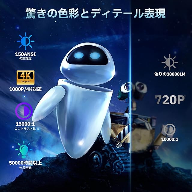 【幅広い対応・1年間付】PC、Switch、USBストレージ、PSゲーム機、スピーカー、ヘッドフォンなど、さまざまなデバイスと簡単に接続でき、ゲームや映画、プレゼンテーションなど、幅広い用途に対応。HDMI、USB、3.5mmイヤホンジャックを内蔵しており、シームレスな接続が可能です(HDMI接続ケーブルは別売りです)。本製品には1年間のが付いており、万が一プロジェクターに不具合が発生した場合は、メールにてお気軽に弊社までご連絡ください。また、日本語の取扱説明書が必要な場合も、カスタマーサービスまでご連絡いただければ、電子版をお送りいたします。