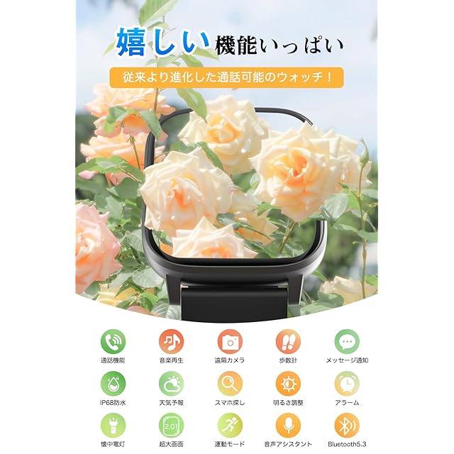 【実用な機能満載・SOS機能/電卓/座りがち注意など】日付表示、歩数計、天気予報、アラーム、データ同期、時計機能はもちろん、通話機能、遠隔カメラ、座り過ぎ注意、音声アシスタント、スマホ探し、SOS機能、電卓、懐中電灯、音楽制御/再生 など機能もあります。