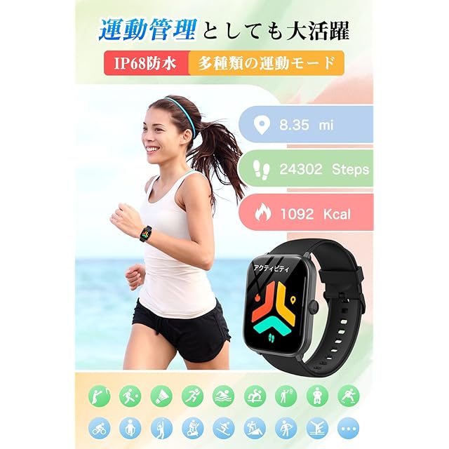 【100種類運動モード・IP68防水防塵】このスポーツウォッチは屋外屋内のランニング、バスケットボール、サイクリング、野球、ヨガ、縄跳び、バドミントン、テニスなど100種類運動モードが付いて、合理的に運動量、運動時間を管理することができます。IP68の防水性を備えているので、日常生活の手洗いや洗顔の際はもちろん、汗だくのスポーツにも気にせずに使用できる スマートウォッチ です。※お風呂、サウナ、温泉などのご利用はお控えください。