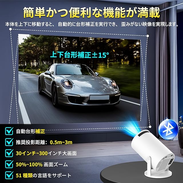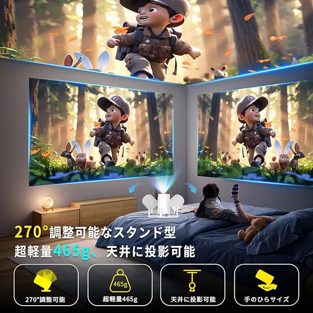 【高音質HiFiスピーカー・300インチ大画面・短距離投影・自動台形補正機能】】プロジェクター には HiFiスピーカーを内蔵しており、外付けのスピーカーと接続必要ないです。迫力のある低音と割れない高音に優れた表現力を持ち、場所を選ばずいつでもステレオで臨場感あふれる視聴体験を実現できます。アスペクト比4:3/16:9のディスプレイをサポートしています。0.5M~3Mまで短距離投影でき、小さい部屋でも十分に使え、手軽に30インチから300インチまでの大画面で楽しめます。画面の表示サイズを固定距離で100~50%を調整可能頻繁にプロジェクターの投影距離の調整も必要なく便利です。床に眠りながら、プロジェクターを動かなくてもリモコンで画面のサイズを調整できます。 台形補正機能が±15度の調整も簡単に行えます、お部屋の空間に応じて設置できます。※一部のアプリケーション画面ではリモコンのカーソルを切り替える必要があります。