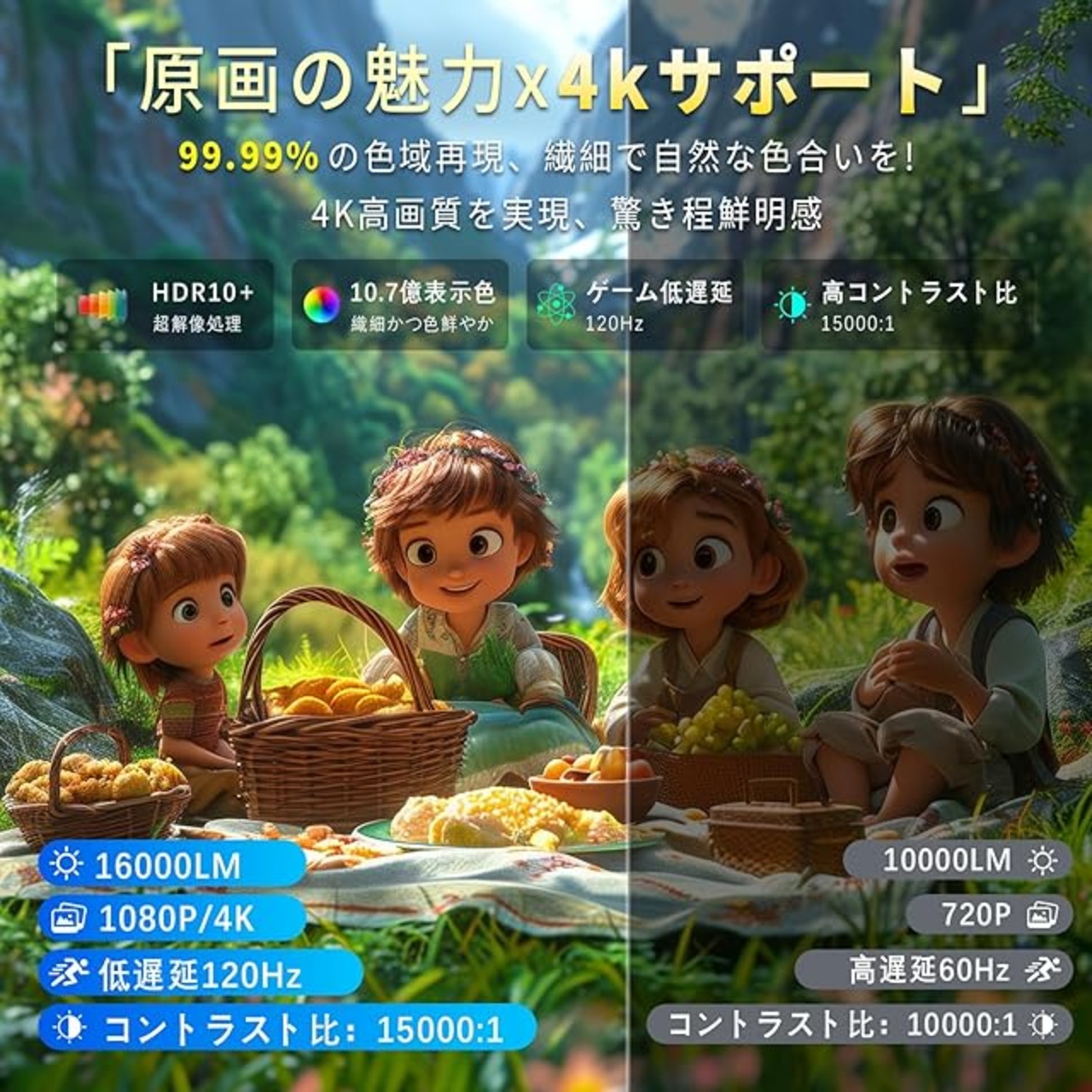 【18000ルーメン高輝度・1080P高解像度・4K対応】プロジェクターは 小型18000ルーメンに向上し、ネイティブ解像度は1080Pにアップグレードされ、NTSC色域の95%以上をカバーし、色再現性が高く、投影された画像は鮮明で、元の色に近くなります。プロジェクターはスクリーンなしで白い壁に直接投影することができ、自然な形で詳細な色を再現し、美しい画像を楽しむことができます。優れた12,000:1のコントラスト比を最大限に引き出します。4Kソースも兼用して、綺麗な再生が楽しめます。ホームシアター、スポーツ観戦に最適で、自宅でも高画質な映像を楽しめます。