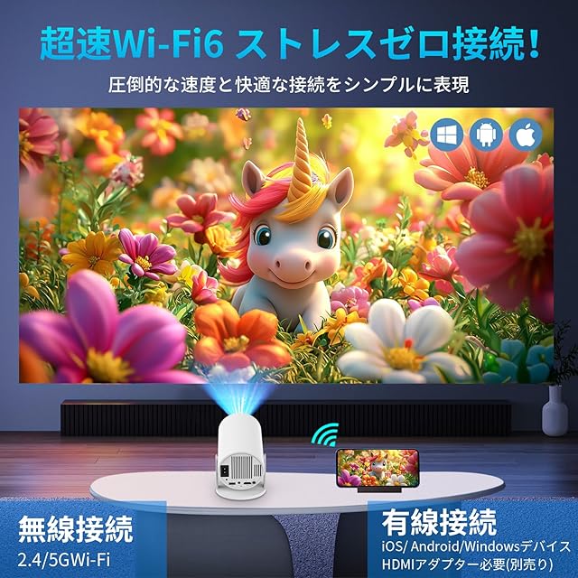 【超高速5G&2.4G・Wi-Fi 6・Bluetooth5.4対応】小型プロジェクターは超高速2.4G+5Gの周波数帯を同時利用でき、安定した信号と高い伝送速度を備えた超高速 6G WiFi 接続テクノロジーも備えています。遅延を最大60%削減されて、より高速で安定したインターネット接続を実現します。Wi-Fi経由でiOS、AndroidおよびWindowsデバイスを素早く接続でき、超スムーズで遅延のないオンラインゲーム、映画鑑賞、ビデオ学習体験を簡単に楽しむことができます。Bluetooth5.4対応により、ご自宅のワイヤレススピーカーと接続すれば、映画館級のサウンド環境を簡単構築。リビングの映画鑑賞から友人とのゲームナイトまで、ワイヤレスと有線を使い分ける柔軟性が、シーンに合わせた最適なエンタメ体験を実現します。
