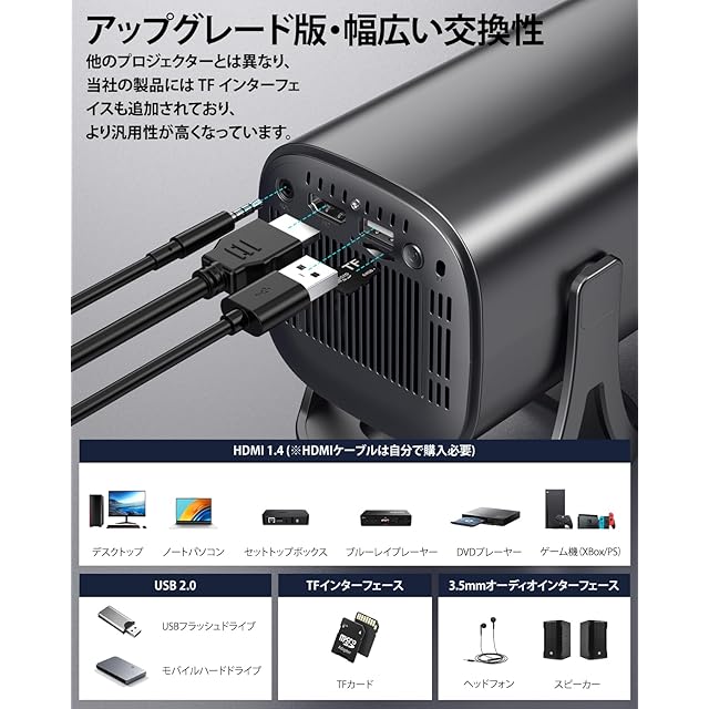 【幅広い互換性・TFインターフェース追加】無線でも有線でも接続できる家庭用プロジェクターは、Wi-Fiに接続すると、内蔵アプリを使って直接視聴できるだけでなく、スマートフォンやiPadにミラー投影して視聴することもできます。さらに、この小型プロジェクターはHDMI1.4、USB2.0、TF、3.5mmオーディオポートも搭載しており、有線接続もできます。デスクトップパソコン、ノートパソコン、セットトップボックス、ブルーレイプレーヤー、DVDプレーヤー、ゲーム機、USBメモリ、モバイルハードディスク、TFカード、スピーカー、有線ヘッドホンなど、様々な機器と互換性があります。