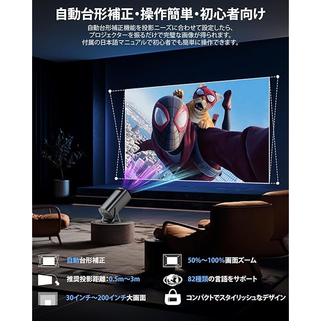 【Bluetoothリモコン・360°全方位調整&初心者向け】こんな悩みを抱えたことはありませんか?赤外線リモコンはプロジェクターの受信窓に正確に位置合わせする必要があり、近距離からしか操作できません。そうでないとリモコンが反応しません。また、赤外線リモコンは壊れやすいという問題もありました。このBluetoothリモコン付きプロジェクターはこれらの問題を解決します。距離や角度に制限がなく、10メートル以内のあらゆる角度からプロジェクターを操作でき、よりスムーズな視聴体験を提供します。そして、世界中の方々に優しいプロジェクターは、日本語、英語、中国語、スペイン語を含む82言語に対応しており、ニーズに合わせてお選びいただきます。また、詳しい日本語の取扱説明書も付属しておりますので、初心者の方でも安心してお使いいただけます。