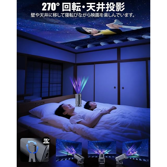 【270°回転・自動台形補正・操作が簡単】一体型スタンドのプロジェクターは三脚が不要、270°回転に対応しており、スタンドを回転させるだけで投写角度を自由に調整でき、壁や天井など、様々な場所に簡単に投写できます。座っていても、横になっていても、リクライニングしていても、リラックスして快適な視聴体験を提供します。そして、自動台形補正機能により、面倒な手動調整は不要で、プロジェクターを振るだけで完璧な投影画像を得ることができます。また、4 点の垂直および水平補正により、傾斜した投影の場合でもリモコンを使用してニーズに合わせて手動で簡単に調整できます。
